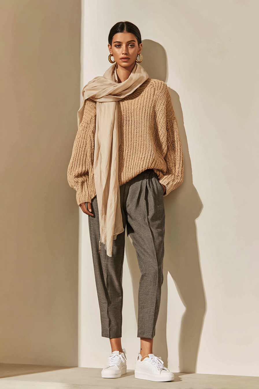 This sophisticated outfit presents a relaxed tan oversized sweater paired with tailored charcoal trousers and simple white sneakers for an unexpected twist. The balance between cozy and polished creates versatile clothing that you can wear effortlessly throughout the day. Add a neutral scarf and gold hoop earrings to tie the look together, all captured beautifully against a soft cream wall that enhances the airy atmosphere.