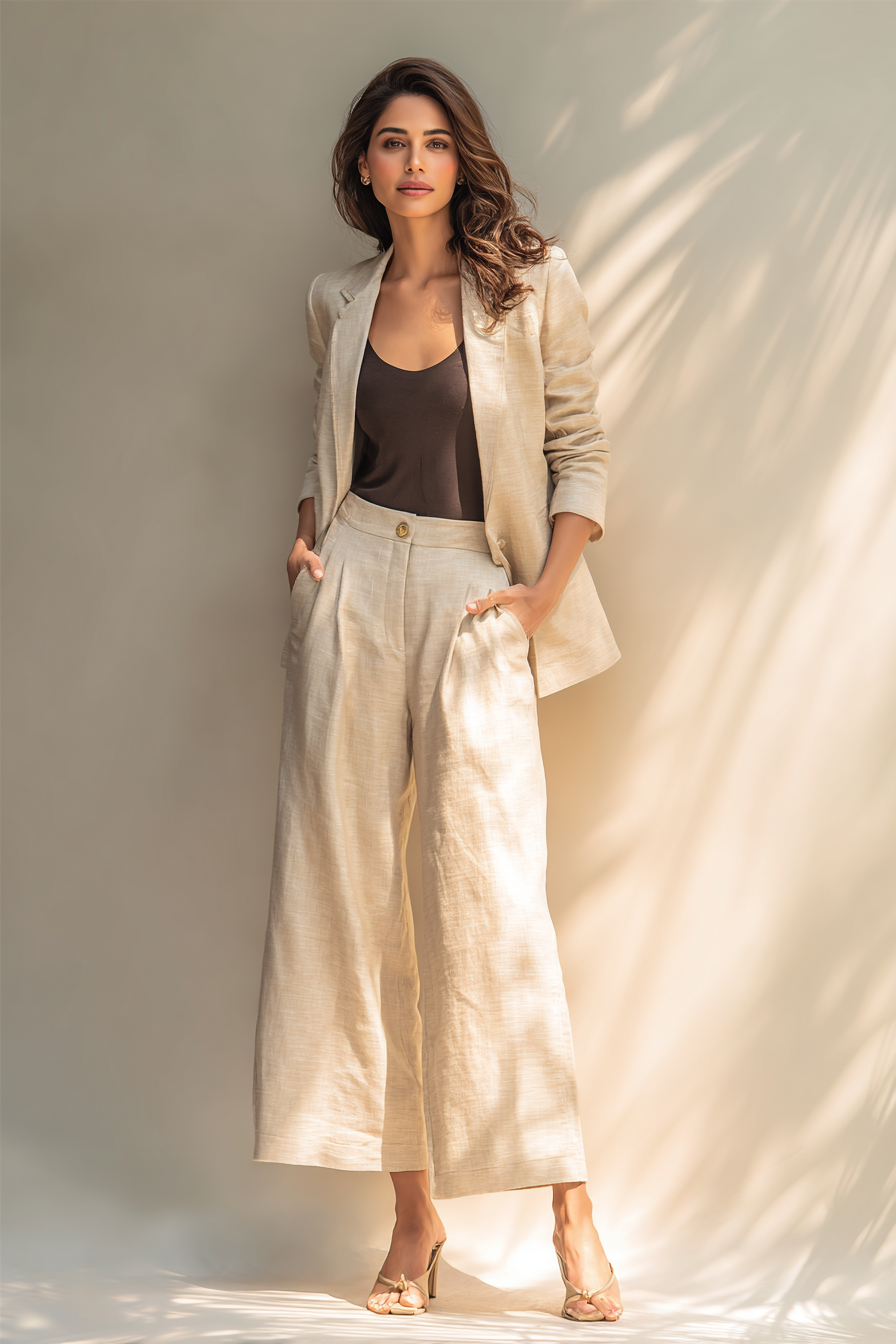 For those who love a polished yet casual look, this ensemble includes a structured linen blazer in light beige, perfectly draped over a simple black tank top, paired with wide-leg trousers. This outfit radiates an air of confidence and luxury, making it ideal for everything from semi-formal events to casual office days. The soft bokeh background highlights the confidence of this look, proving that elegance comes easily with the right pieces.