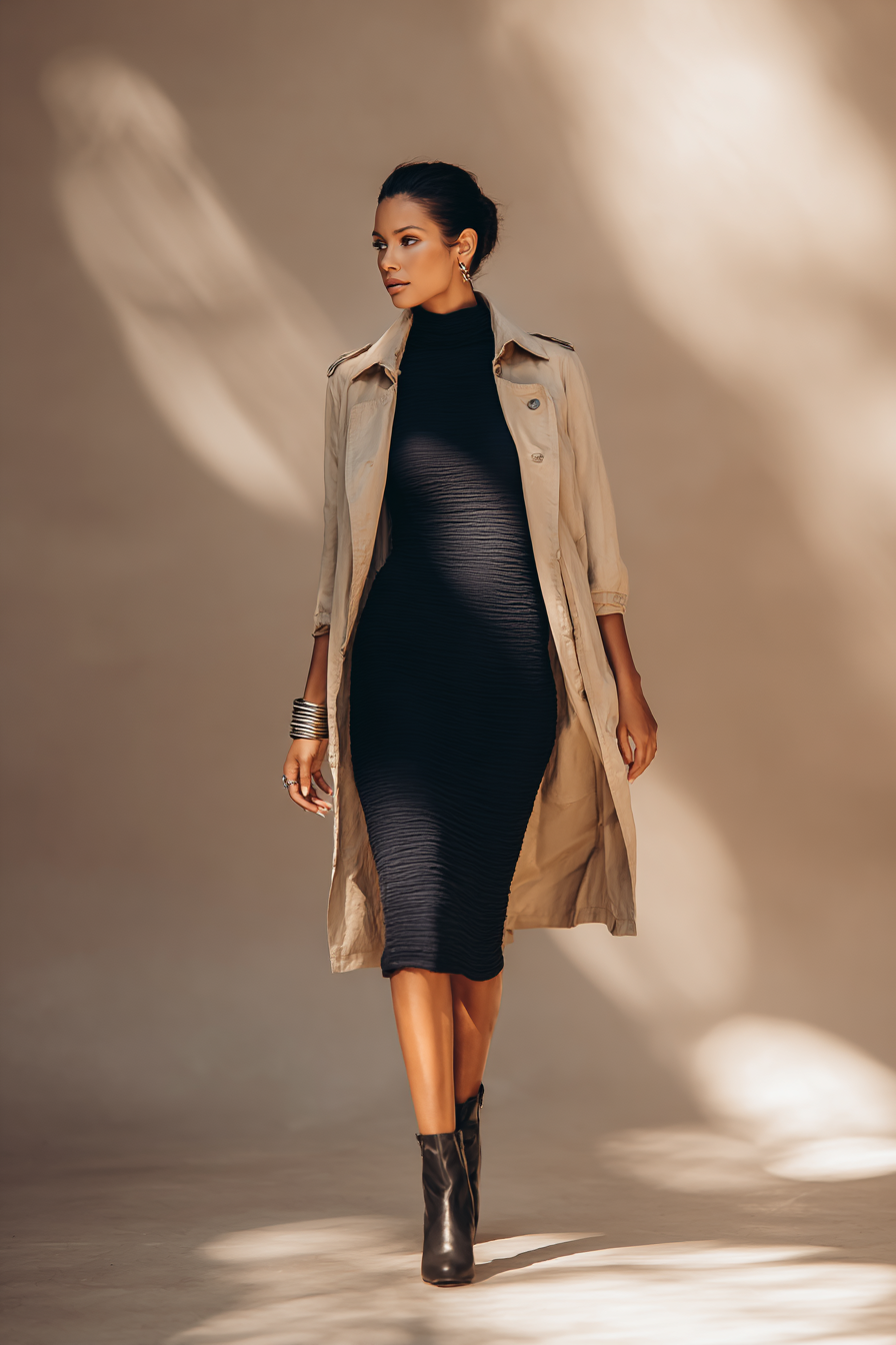 A fashion-forward woman dressed in a fitted navy mock neck dress, layered with a light taupe trench coat. She completes her look with sleek ankle boots and understated silver bangles, posing against a serene bokeh background. The soft studio lights highlight the texture of the fabrics, showcasing a sophisticated and polished style.