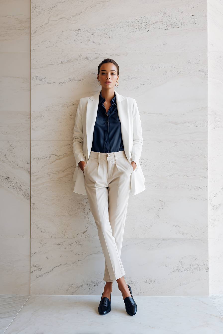 This timeless ensemble features a structured white blazer effortlessly layered over a fitted navy blouse, paired with tailored beige trousers and classic black loafers. The combination is perfect for creating an aspirational vibe that balances professionalism with chic aesthetics. This outfit not only embraces the principles of versatile fashion but also adapts seamlessly from day to evening events.