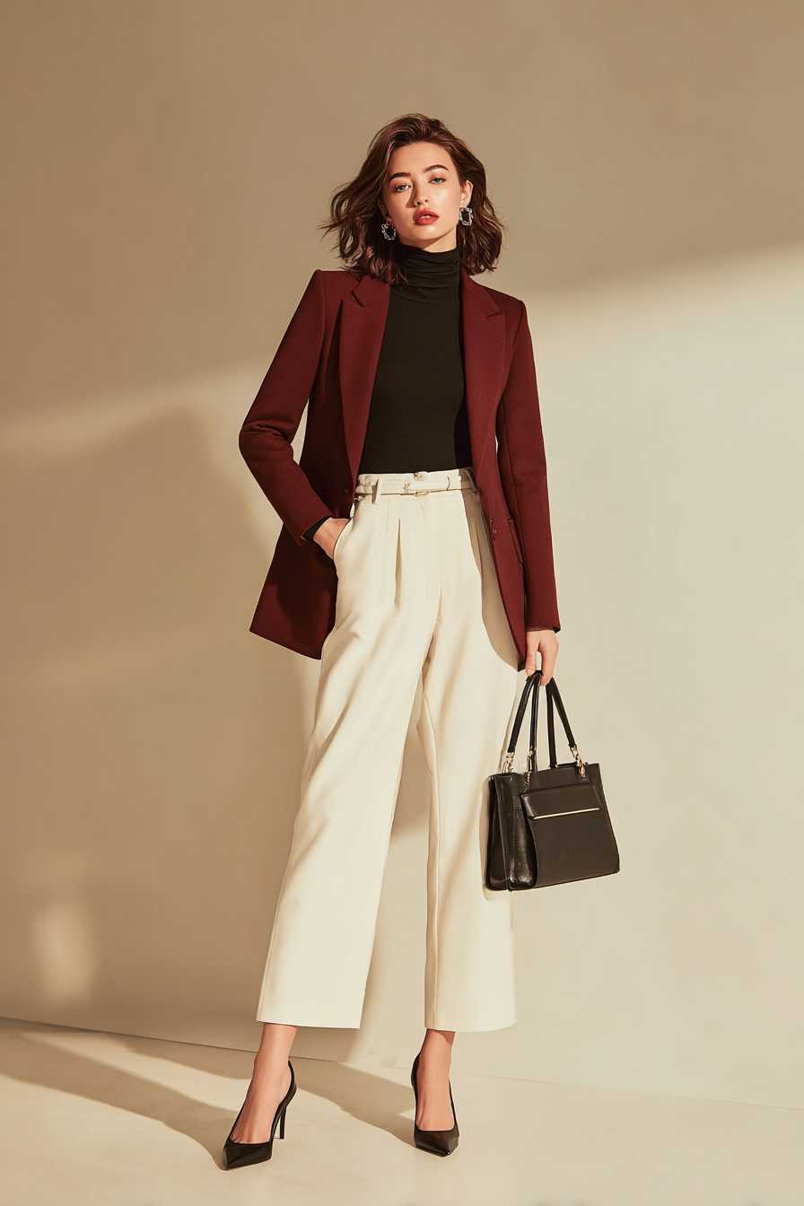 Sleek and sophisticated, this look features a structured burgundy blazer that brings vibrancy to any wardrobe. Paired over a tailored black turtleneck, it creates a polished ensemble that’s perfect for both work and play. The wide-leg cream trousers offer comfort while maintaining an elegant silhouette. Paired with a minimalist black handbag and black pointy-toed heels, this outfit is the very definition of effortless style.