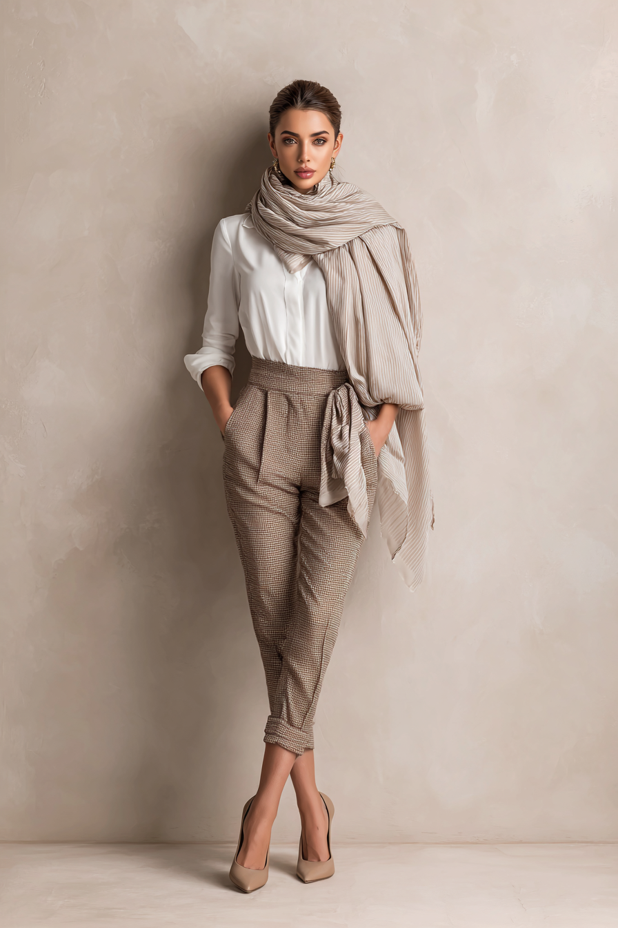 For a refined look, try a fitted white blouse tucked into high-waisted tailored trousers in a soft taupe hue. This combination is not only timeless but also versatile enough for various occasions. Completing the outfit with sleek pointed heels and a chic oversized scarf draped around the neck adds an effortless touch of style. The gentle studio light highlights the beautiful textures, creating a polished and sophisticated silhouette.