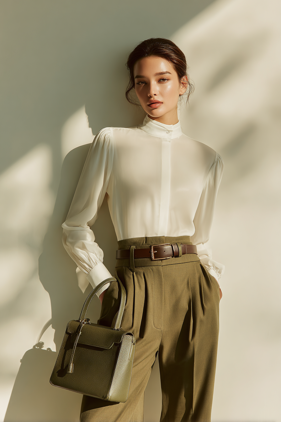 This timeless outfit features a fitted ivory blouse tucked neatly into high-waisted tailored trousers in a rich olive green. The contrast between the soft ivory and bold green creates a visually appealing look that conveys sophistication. A sleek leather belt and a matching structured handbag complete this ensemble, making it suitable for any event—from a school meeting to a lunch with friends.