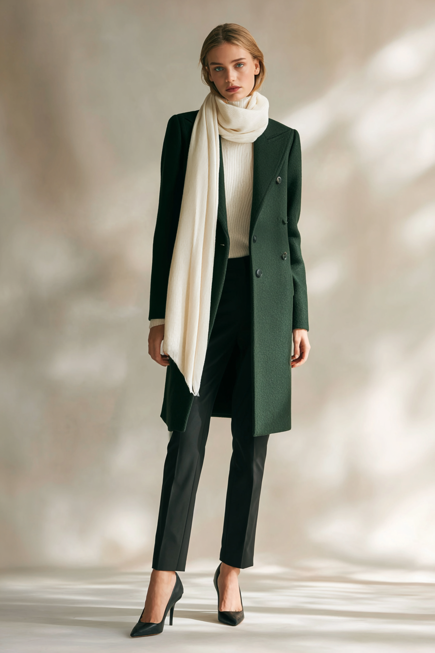 This stylish look features an elegantly fitted dark green wool coat, draped with a cream cashmere scarf that adds a touch of luxury and warmth. The tailored black trousers create a sleek silhouette while the classic pointed-toe pumps bring sophistication to the outfit. This combination of textures and colors not only looks polished but also captures the essence of autumn’s bounty.