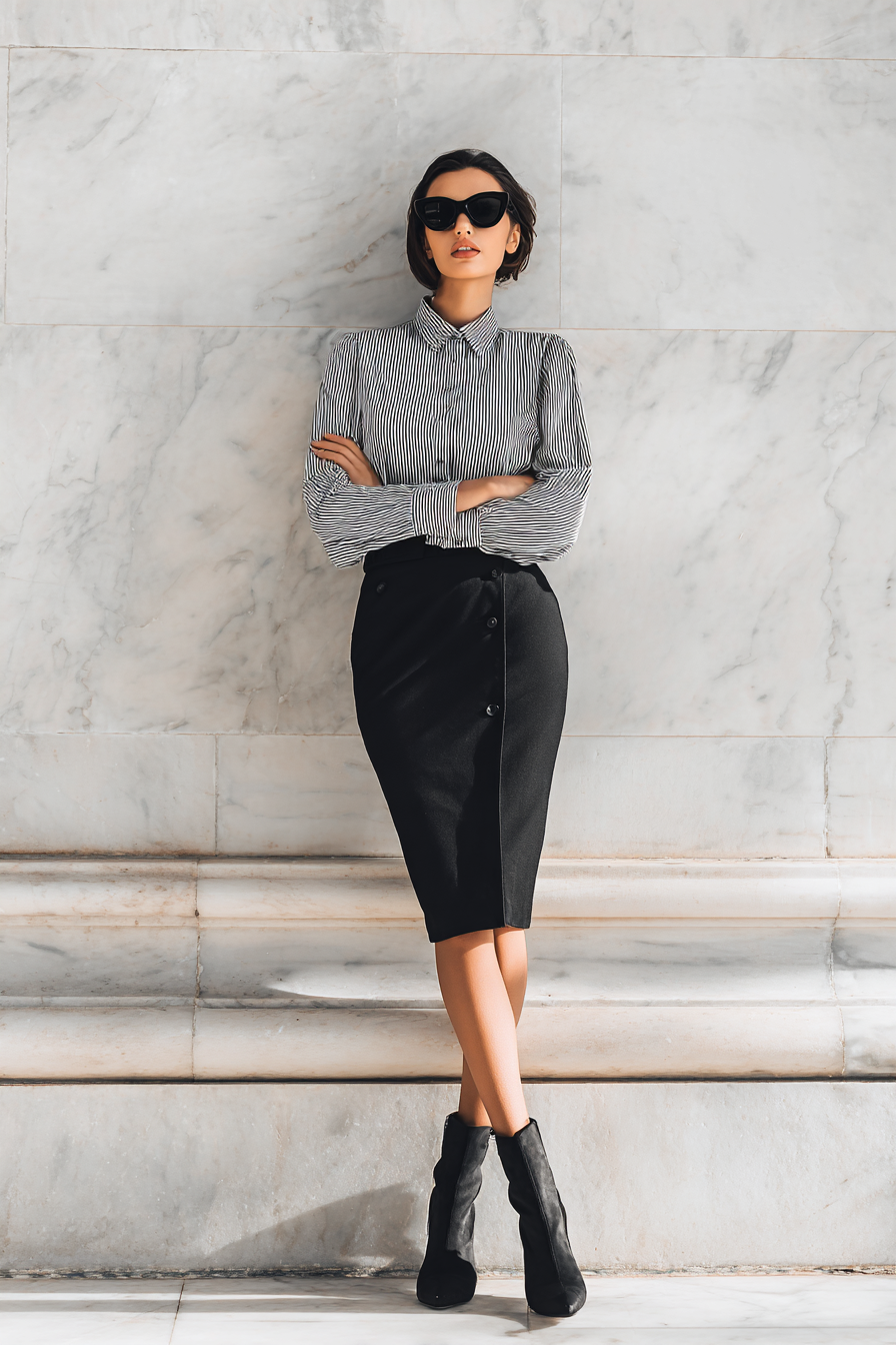 Exude confidence with this stylish ensemble featuring a tailored black skirt paired with a light gray fitted blouse. The combination is both minimalist and striking, perfect for various settings. Adding elegant black ankle boots not only completes the look but also ensures comfort and ease. The minimal marble background, enhanced by soft window lighting, speaks to a polished and timeless fashion trend.