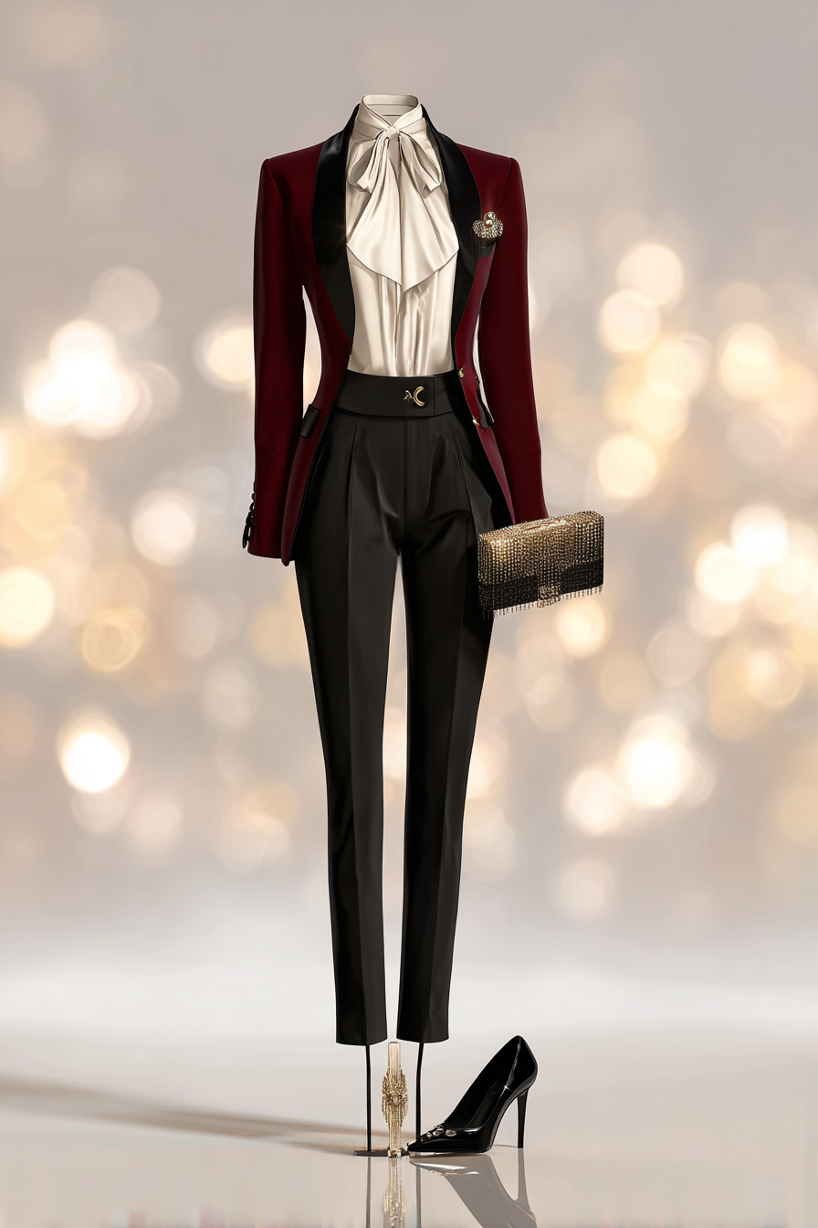 For a sophisticated ensemble, opt for a merlot tailored blazer layered over a fitted ivory silk blouse. This striking combination, paired with high-waisted black trousers, creates a polished and refined appearance that is simply stunning. Glossy black pumps and a sleek clutch accentuate the luxurious feel of this outfit. The softly blurred bokeh background adds an artistic touch that highlights the dreams of opulent living.